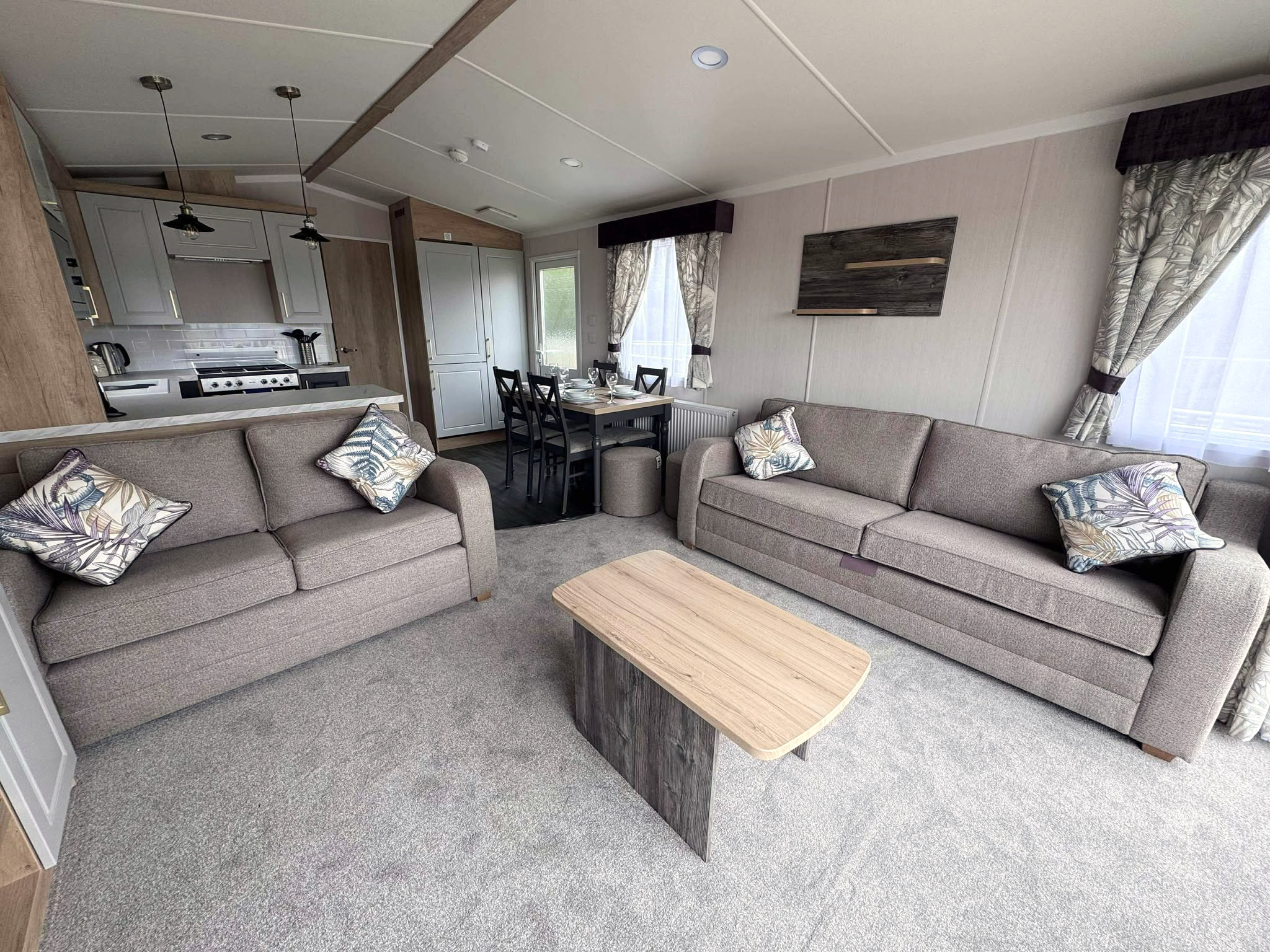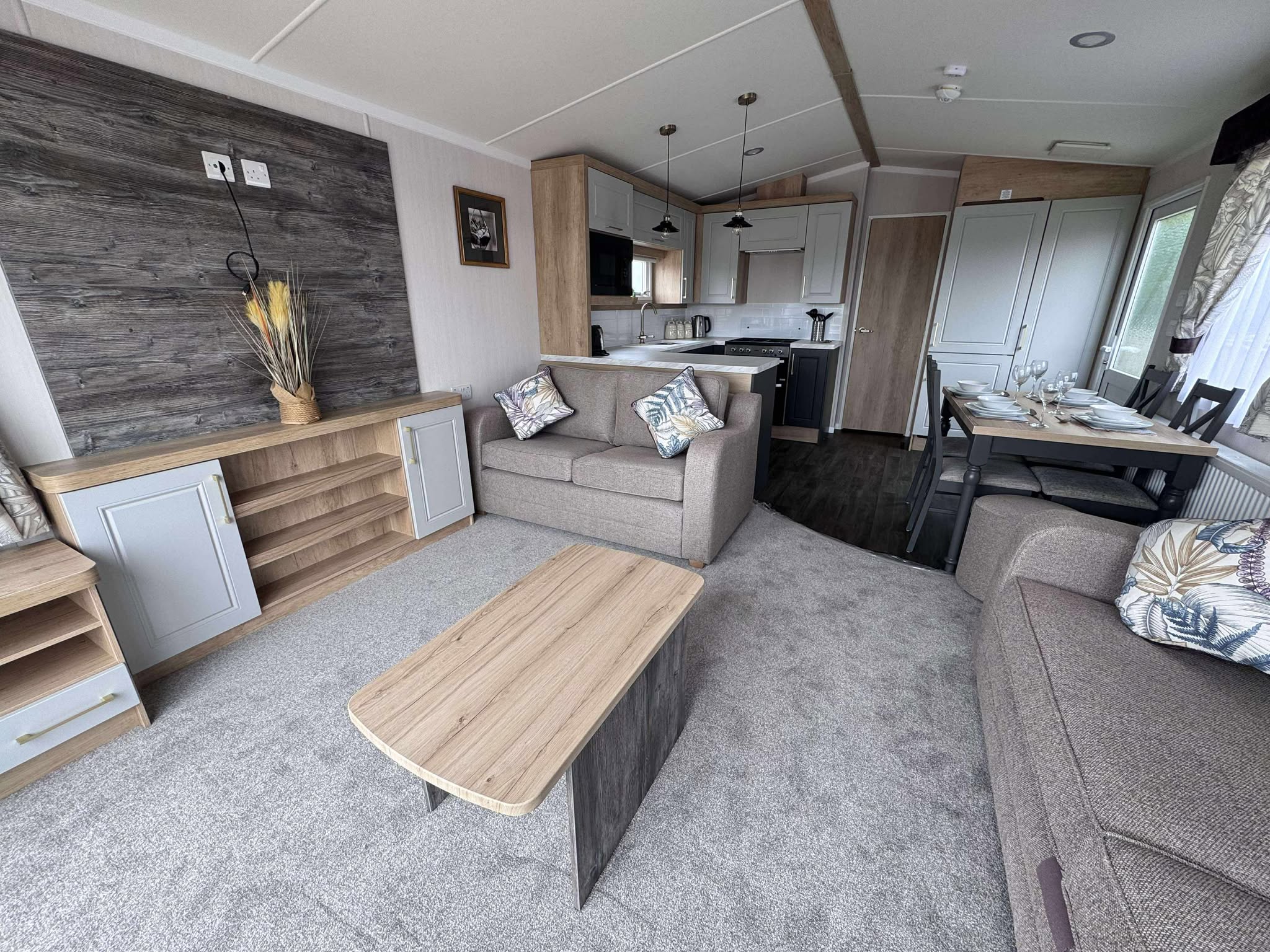 The 2025 Regal Hemsworth static lodge is a two-bed holiday home of grand proportions that has been completed to the highest standards of design, comfort, and specification. Owners will be able to gain access to the holiday home via a bespoke wooden veranda, and through the large patio sliding doors which lead owners into the lounge area. This living room has a home from home feel and includes comfortable L-Shaped sofa, contemporary room divider and a stylish TV and storage unit. USB sockets are provided in the lounge for the owner’s convenience.