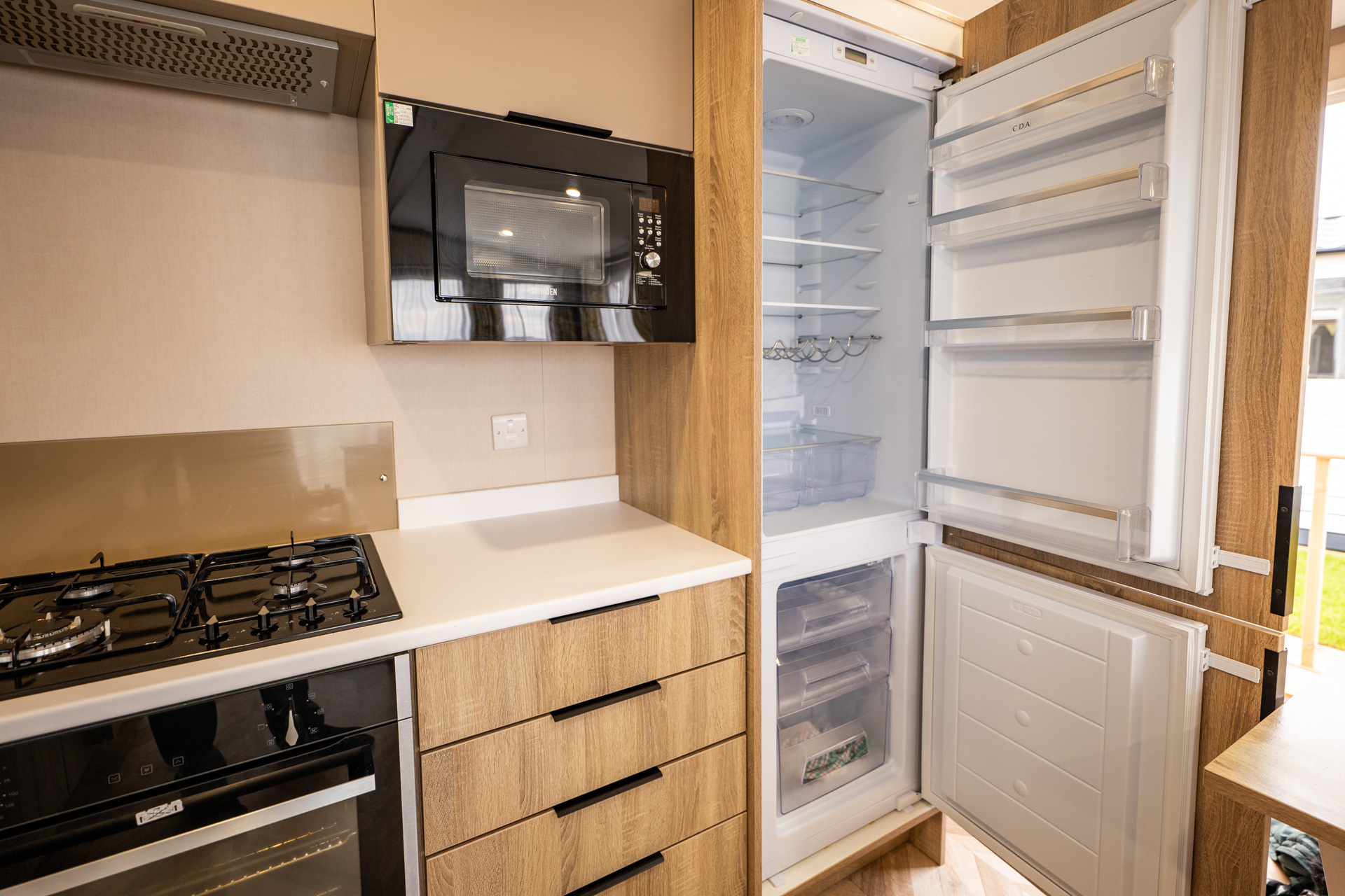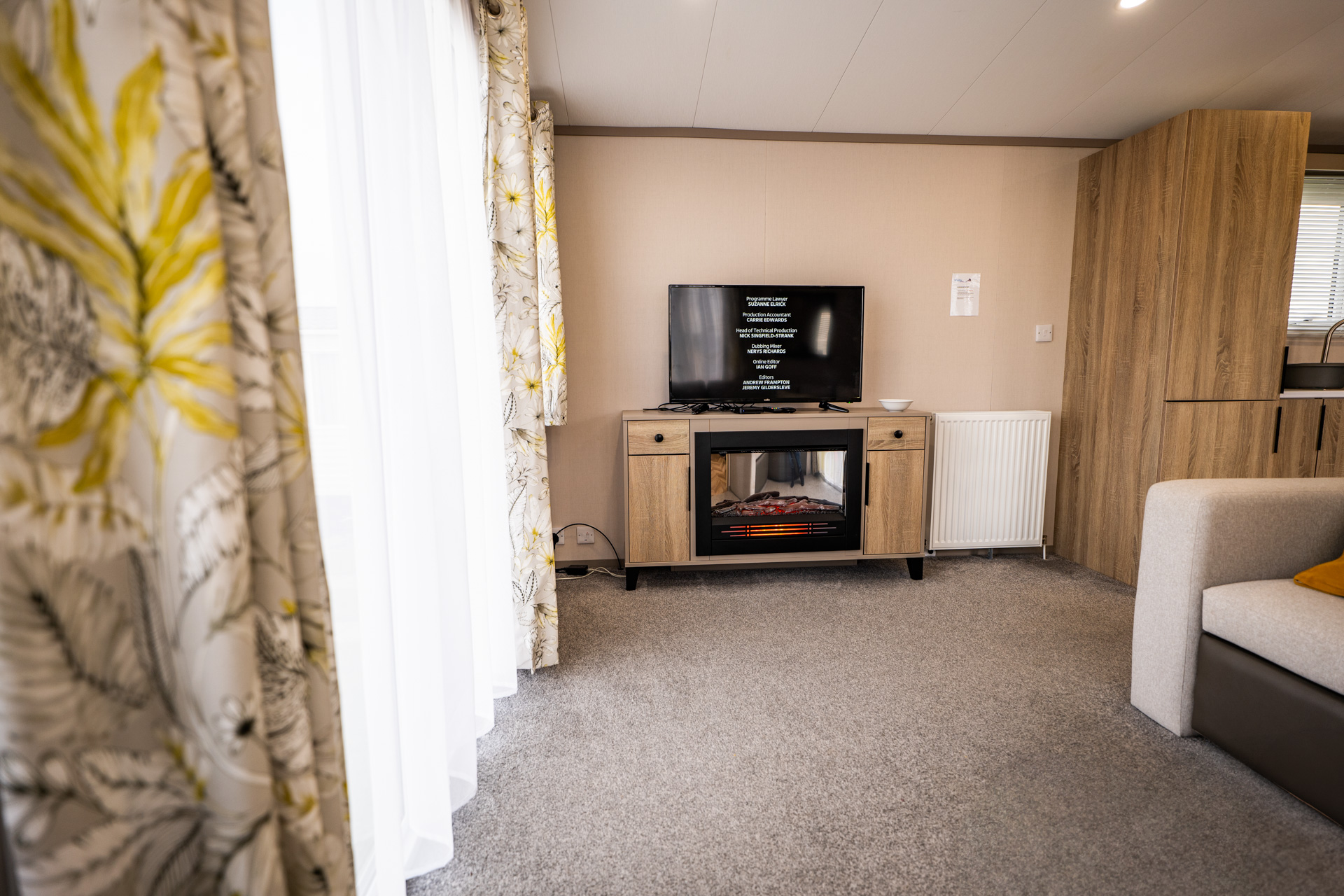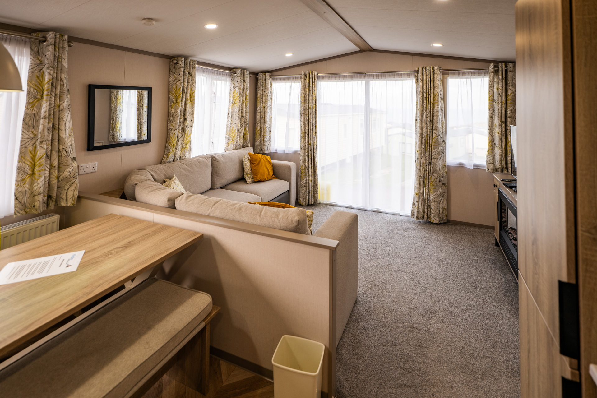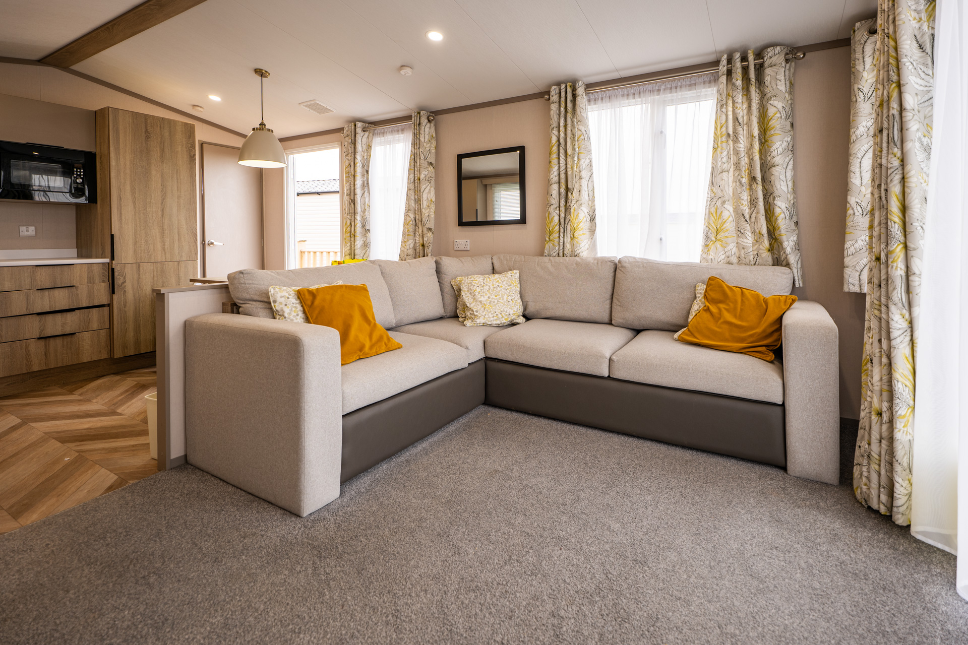 The 2025 Regal Hemsworth static lodge is a two-bed holiday home of grand proportions that has been completed to the highest standards of design, comfort, and specification. Owners will be able to gain access to the holiday home via a bespoke wooden veranda, and through the large patio sliding doors which lead owners into the lounge area. This living room has a home from home feel and includes comfortable L-Shaped sofa, contemporary room divider and a stylish TV and storage unit. USB sockets are provided in the lounge for the owner’s convenience.